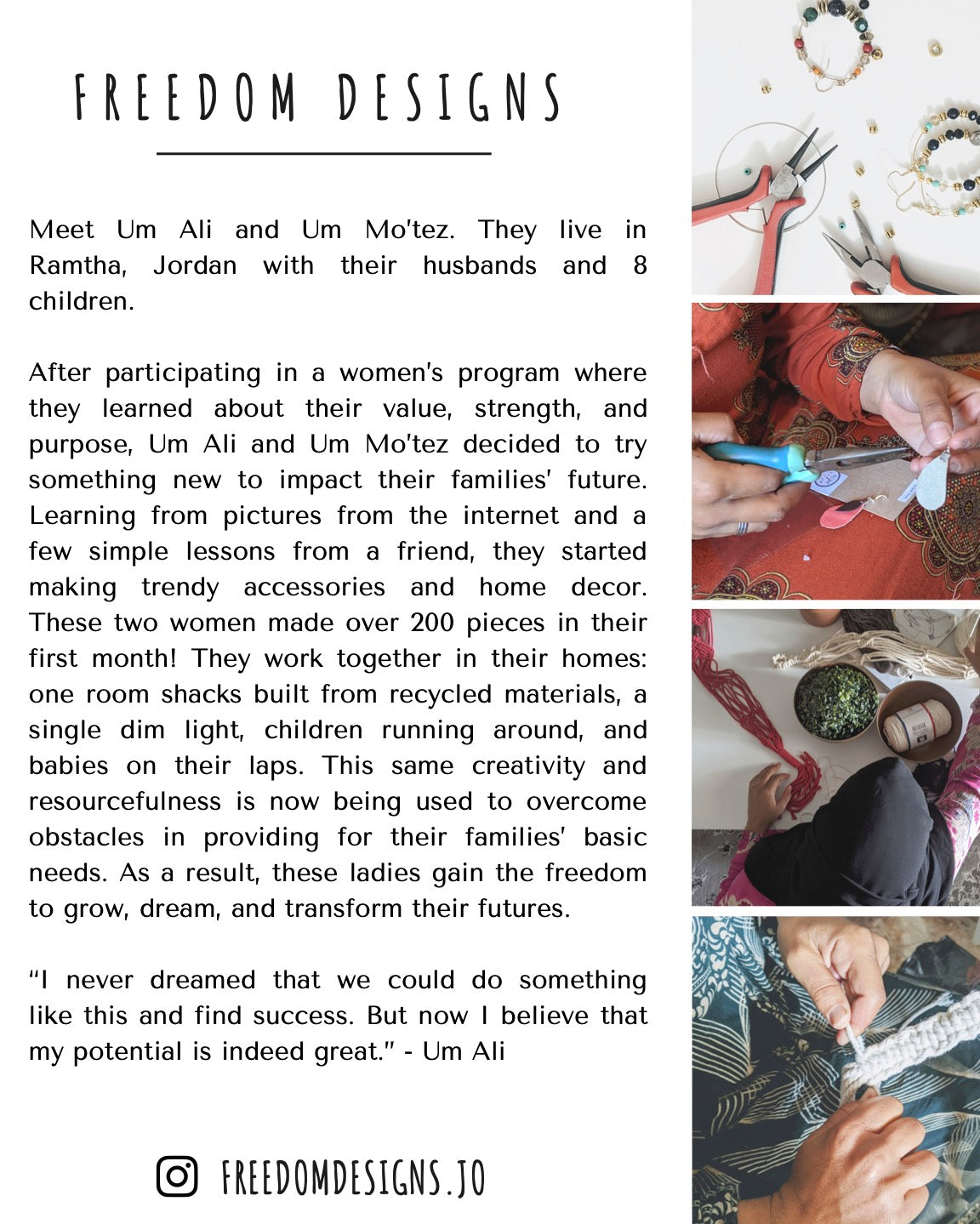 "Freedom Designs leather earrings are made from up-cycled leather jackets. They strive to source all their jewelry materials from local stores in Jordan to support other artisans and small business owners. Your purchase goes right back to the women who handcrafted these earrings. Celebrate local. Celebrate Freedom."