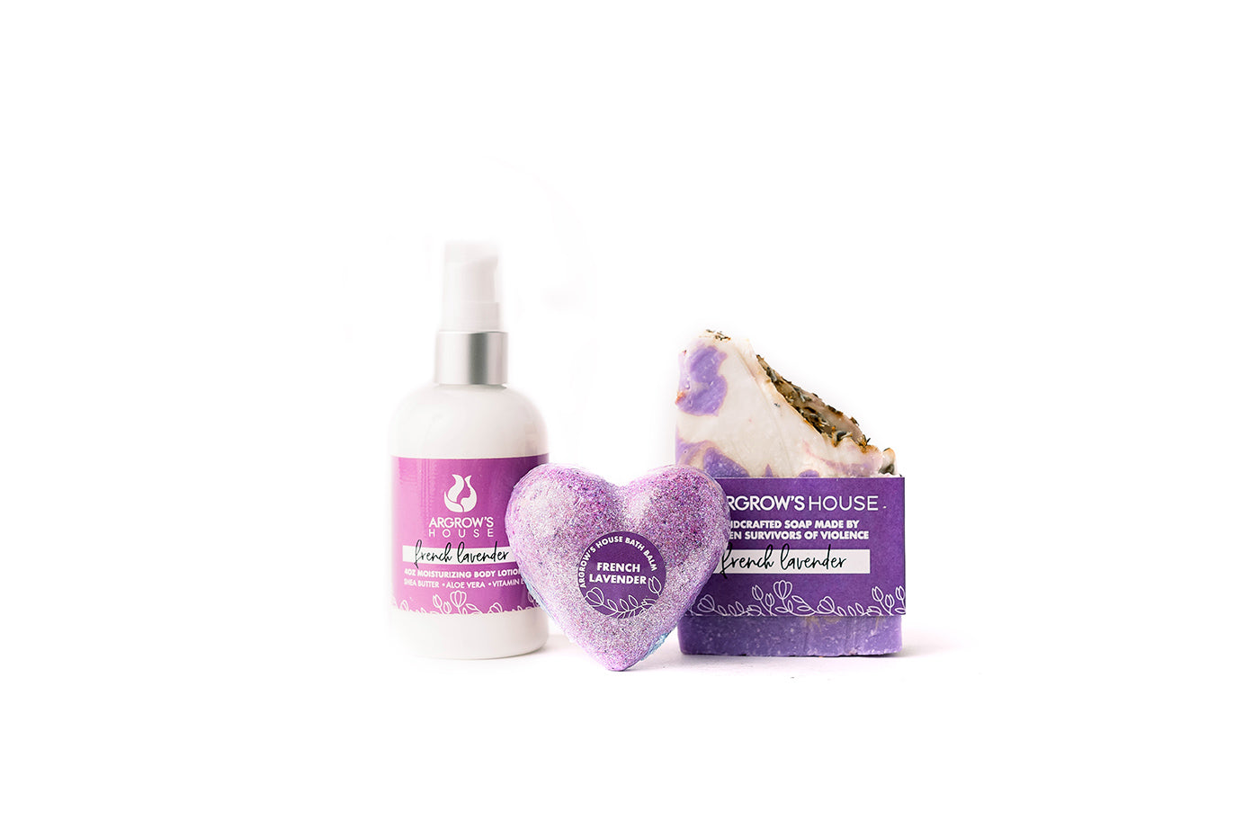 - Trio set includes: soap, French lavender body lotion and bath balm.